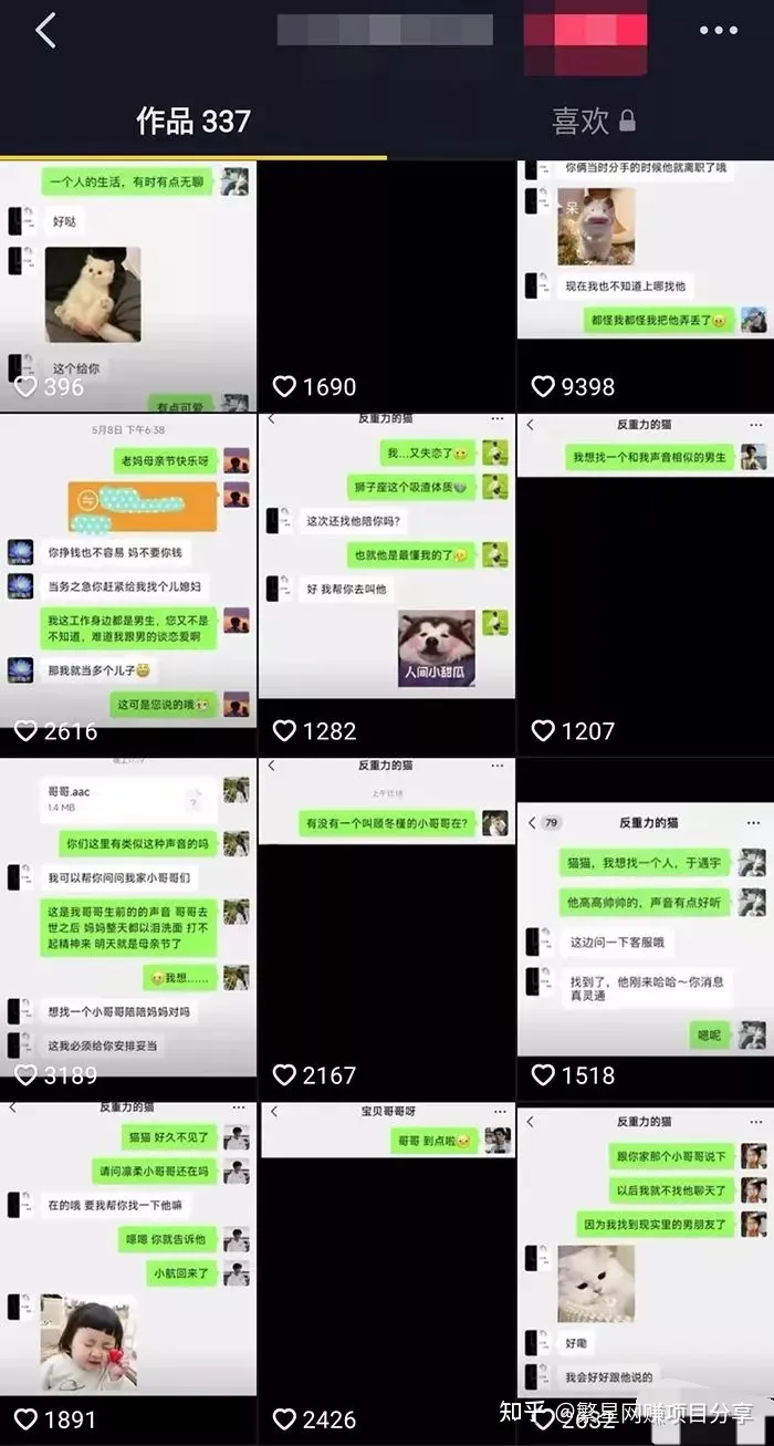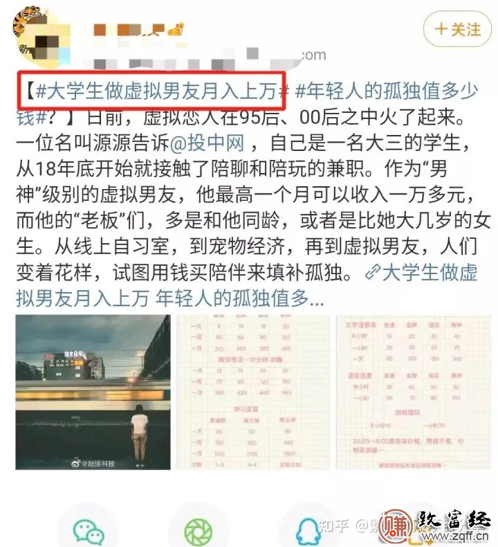 基本他的运营模式就非常清晰了,抖音引流到公众号私域平台,私域平台对接第三方平台,或者自己做的平台进行收益。 这种账号变现方式因为比较直接,所以只要播放量高,就可以获得变现。 而这类账号对于剪辑的要求也比较低,截屏记录客户与“虚拟恋人”聊天的视频能轻松获得数万点赞和评论,可以看出这个项目还是非常好做的。 ![]() 从目前情况来看,可以个人操作,也可以团队操作。无论你是男生女生,都有人在玩,反正都是隔着屏幕,谁也不知道对面是什么样子,女生刚好可以发挥你甜美的声音。 如果是男的,就去弄好声音转化工具,直接变成女生。现在很多工作室都是这么干的,一群抠脚大汉,天天用变声器和男的聊。 80后老板分享脱单技巧 一月收入10万 知乎就有一个外企网友老陈,通过虚拟恋人这个项目,一个月赚了十万。想知道他是如何做的吗?听我给你讲完,你就瞬间明白了。 这个网友老陈,他在网上找了很多女性脱单的技巧和小案例,然后一条一条用聊天记录的方式发在抖音上面。情感类型的内容本来就很吸引单身的女孩,所以不到一个月的时间,涨粉了二十万。 那他是如何把这些粉丝变成钱的呢? 据老陈说,后期他提供了一项线上陪聊服务,按照类型和时间去收费。有吐槽型的,有聊天型的,还有刚才说的虚拟男友型。价位主打高价格,从299到1999元不等。 ![]() 就这样一个月多账号操作下来,居然有三、四百人下单,十万轻轻松松到手。 有人好奇,问他怎么会有这么多人买他这个聊天服务。 老陈回答,现在人的压力越来越大,圈子反而越来越小。有的时候呢,工作压力大,生活压力大,家人、朋友、同事都不方便说,这个时候,就需要找一个陌生人来倾诉。 听他说完,大家会不会觉得不可思议,陪聊竟然也能月入10W?但真实情况就是这样! 说句心里话,人和人的差距主要在认知上,因为认知差,所以产生了财富以及其它方面的差距。 除了佩服他这个商业眼光之外,我更加确定地认为,这个社会赚钱的机会,每天都在发生,而且就在我们身边,只是有的人看得见,有的人看不见。 那么,这类型的服务需求量怎么样呢? 这么多种类的自媒体里,流量起的最快、最容易变现的类型之一就是虚拟恋人类账号。一是因为刚需,量大。二是因为没标准、没专业性,门槛低。 先看抖音流量,是十分巨大的,到处都是几万几十万的流量。 ![]()